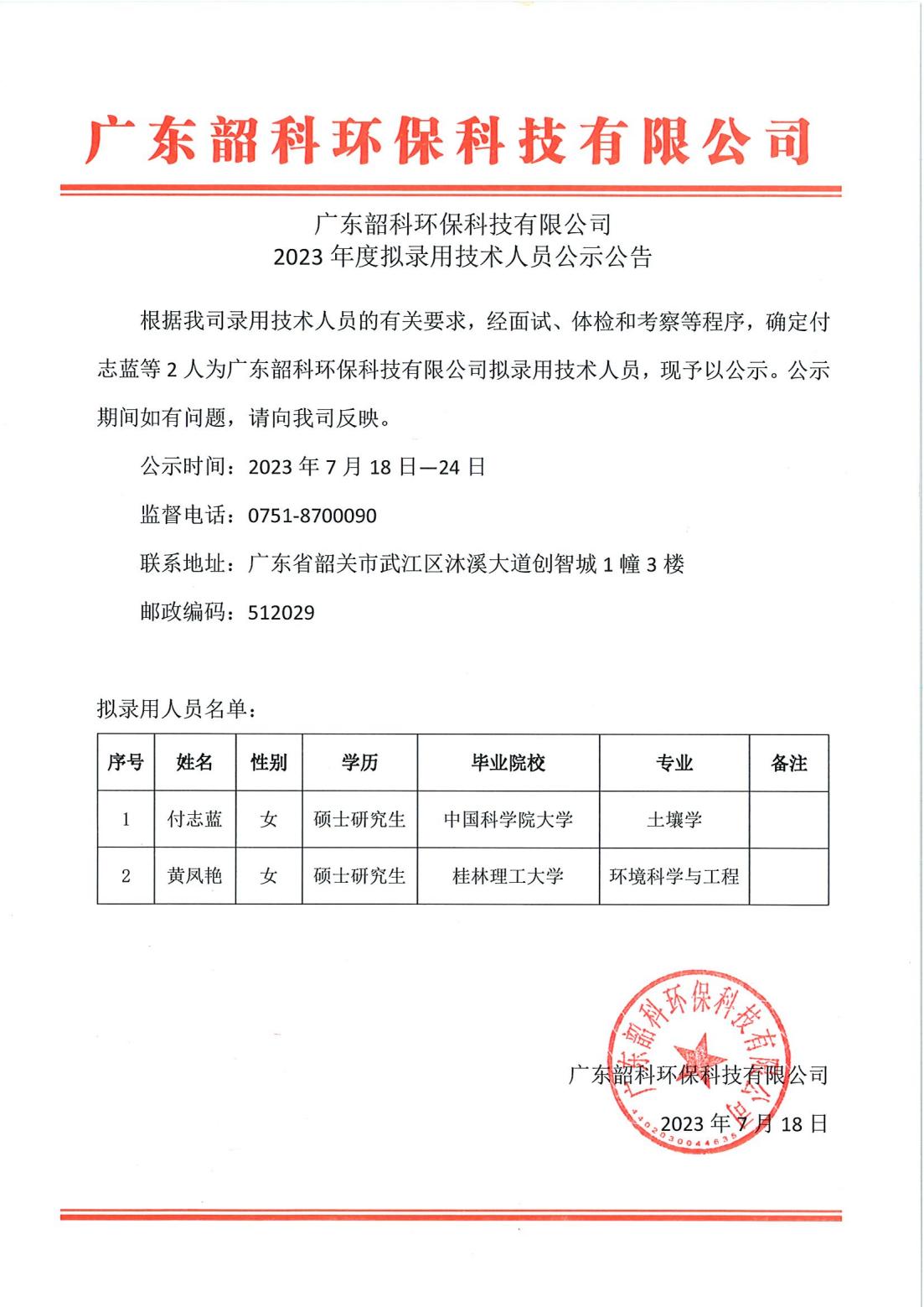 根據(jù)我司錄用技術(shù)人員的有關(guān)要求,經(jīng)面試、體檢和考察等程序,確定付志藍等2人為廣東韶科環(huán)??萍加邢薰緮M錄用技術(shù)人員,現(xiàn)予以公示。公示期間如有問題,請向我司反映。